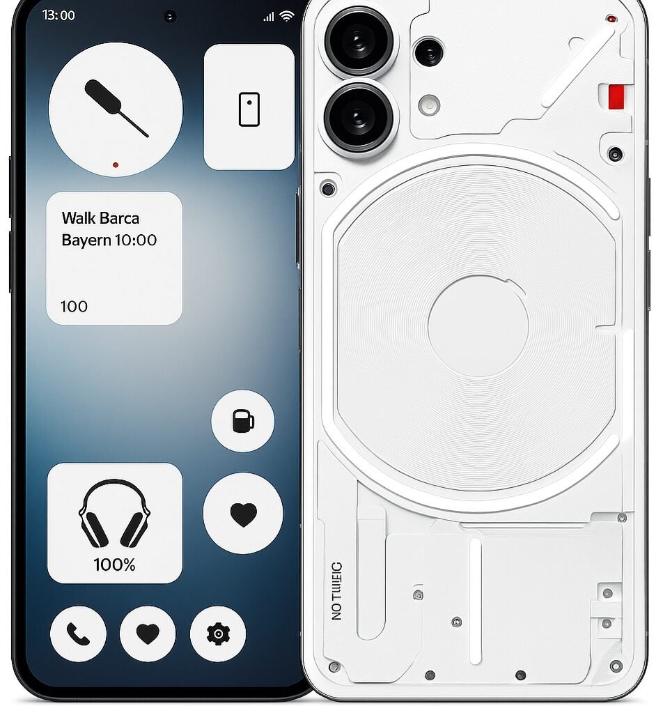 Nothing Phone (1) Released 2022 · 193.5g · 8.3mm · Android 12 · 128GB 6.55″1080×2400 px 50 MPMain Camera 8GBRAM